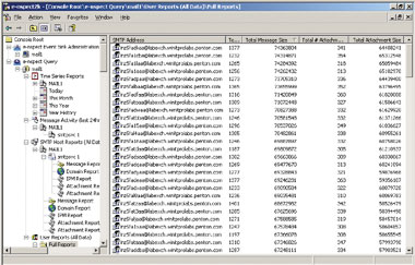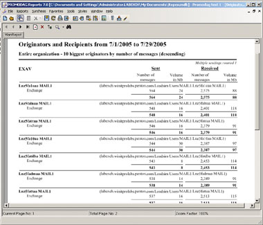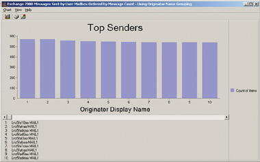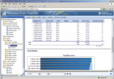Продукт предоставляет достаточное количество предварительно созданных отчетов. Существенным недостатком системы является отсутствие возможности создания отчетов по типам присоединенных к сообщениям файлов. Например, администратор не сможет найти все МР3-файлы, которые пользователи сохраняли в своих почтовых ящиках Exchange. Представители Quest говорили мне, что такая возможность будет доступна в следующих версиях. MessageStats поддерживает отчеты о загрузке как хранилища, так и томов (в мегабайтах) посланными сообщениями и может суммировать данные для нескольких организаций Exchange. PROMODAG и e-nspect2000 также могут создавать отчеты о данных для нескольких организаций Exchange, но данные в этих продуктах не объединены так, как это сделано в отчетах MessageStats.