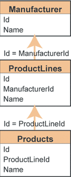 Если имеется иерархия производитель — линейка товаров — товары, то выборка всех товаров, к примеру, производится следующим оператором: