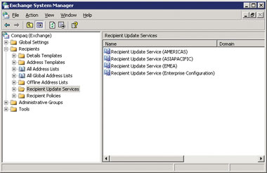 Можно создать множество экземпляров RUS для домена, при условии что каждый экземпляр будет ассоциирован со своим DC — каждый экземпляр станет источником обновления AD. «Размазывание» процесса обновления по нескольким экземплярам RUS — отличный вариант при распределенной топологии домена или если есть сомнения в скорости репликации AD. Конечно, Exchange не сможет работать эффективно, если репликация AD ненадежна; поэтому, коль скоро вы столкнулись с такой ситуацией, сначала необходимо решить проблемы с репликацией AD, а затем централизовать, насколько это возможно, RUS. На экране 3 показаны экземпляры RUS компании HP, в которой развернута одна из крупнейших в мире почтовых организаций Exchange 2003 (число записей GAL перевалило за 250 тыс.). Как можно заметить, помимо экземпляра по умолчанию, Enterprise Configuration, для каждого из трех географически ориентированных доменов, в которых есть серверы Exchange, имеется еще только по одной службе RUS.