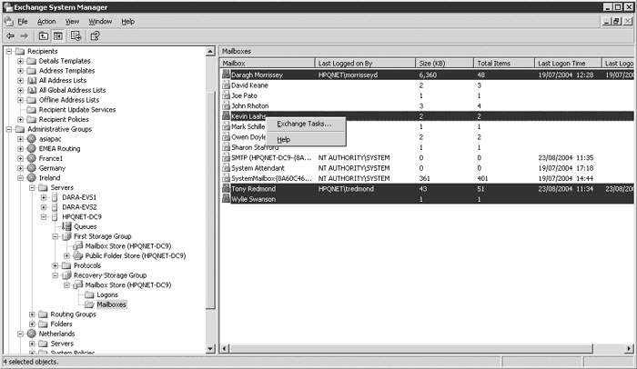 Экран 4. Выбор почтовых ящиков, подлежащих восстановлению из группы хранения RSG