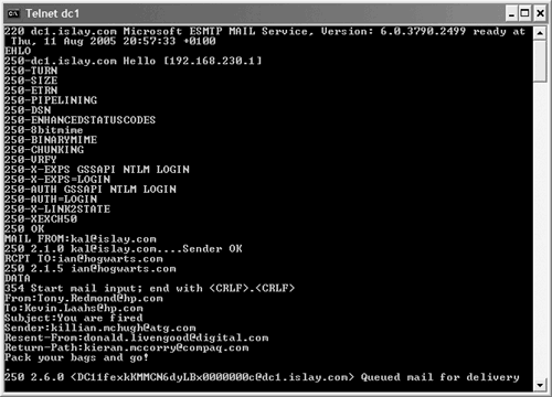 Определение домена электронной почты. На экране 1 показаны необработанные данные SMTP-диалога, который содержит оболочку и контент SMTP-сообщения, полученного виртуальным сервером Exchange. Оболочка (все элементы, предшествующие команде DATA) содержит информацию, необходимую для пересылки и доставки сообщения. Контент (все элементы после команды DATA) указывает объект, который должен быть доставлен получателю. Контент состоит из полей заголовка, за которыми следует тело сообщения.