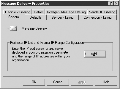 Чтобы настроить фильтр на глобальном уровне, следует открыть ESM, щелкнуть правой кнопкой мыши на Message Delivery в разделе Global Settings, а затем выбрать пункт Properties. Появится диалоговое окно Message Delivery Properties, в котором нужно настроить параметры на вкладках Sender ID Filtering и General. На вкладке Sender ID Filtering следует просто указать желательный режим (отвергнуть, удалить или принять) для сообщений, не прошедших проверку. На вкладке General (экран 2) необходимо настроить список Perimeter IP List и параметры Internal IP Range Configuration. Эти параметры влияют на метод определения подключающегося IP-адреса. По щелчку на кнопке Add на экране появляется диалоговое окно, в котором необходимо указать все IP-адреса доверенных серверов в организации. Эти серверы будут подключаться к любым серверам Exchange с активным фильтром Sender ID. Обязательно указывается IP-адрес SMTP-узла ретрансляции любого типа, имеющегося в организации, в частности систем проверки контента на базе SMTP. Любые IP-адреса, перечисленные в этом окне, отбрасываются, когда фильтры пытаются определить первоначальный подключающийся IP-адрес с помощью заголовков контента сообщения.
