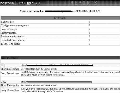 Метод Google позволяет запрашивать конкретные данные о Web-узле, не посылая на него трафика. Из-за этой особенности Google представляет собой обоюдоострый меч: взломщики могут скрыто обследовать Web-узел, но администраторы могут делать то же самое и отыскать потенциальные уязвимые места или нечаянно открытую информацию. Перемещаясь по Web, роботы Google собирают массу информации, поэтому необходимо направить в Google запрос, чтобы выяснить, какие сведения о ваших Web-узлах хранятся в базе данных.