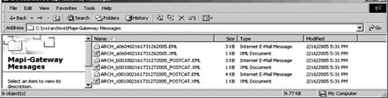 Например, если сообщение адресовано двум получателям — dave@microsoft.com и tony@hp.com, категоризатор создаст две копии сообщения, по одной на каждого получателя. Если активировать событие OnPostCategorize, ArchiveSink создаст набор архивных файлов (т. е. файлов .eml и .xml) для исходного сообщения, а затем создаст комплекты файлов для дополнительных частей. Таким образом, сообщение для двух получателей породит шесть архивных файлов, показанных на экране 4. Дополнительные файлы имеют формат arch_случайный номер_postcat.eml и arch_случайный номер_postcat.xml. Заметим, что файлы имеют разные имена.