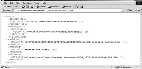 По умолчанию SMTP или Information Store (IS) подтверждают прохождение сообщения через виртуальный сервер SMTP, на котором установлен ArchiveSink, событием OnMessageSubmission. Это событие фиксируется один раз для каждого сообщения, проходящего через транспортную систему сервера Exchange. Когда это событие фиксируется, ArchiveSink сохраняет сообщение в файле .eml и создает соответствующий файл .xml. На экране 3 показан пример такого файла, в котором ясно видно, кто отправитель, кто получатель и к какому файлу .eml относится данный файл. Все получатели, включая скрытых получателей BCC, будут отображаться в этом файле.