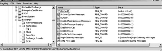 Функциональность ArchiveSink управляется параметрами системного реестра, находящимися в разделе HKEY_LOCAL_MACHINESOFTWAREMicrosoftExchangeArchiveSinkvs_id, которые показаны на экране 5. Три из них уже упоминались (т. е. Enable Message Logging, Enable Precat и Enable PostCat), теперь рассмотрим другие параметры.