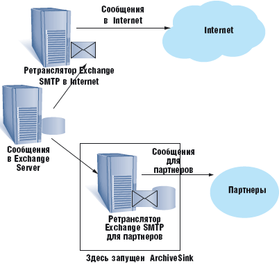 Лучшим местом для ArchiveSink на серверах Exchange являются отдельные серверы-ретрансляторы SMTP, или серверы с внешними интерфейсами в Internet, или сеть другой компании. Общим для сценариев (см. рисунок) является то, что компания имеет соединение с несколькими партнерскими организациями и требуется ведение журнала аудита почтового обмена между партнерами. Основная организация поддерживает два сервера Exchange с ретранслятором SMTP: на одном общее соединение с Internet, на другом — соединение с партнерской организацией. На втором сервере установлен ArchiveSink, и настроен он таким образом, чтобы протоколировать весь трафик SMTP, обрабатываемый этим сервером.