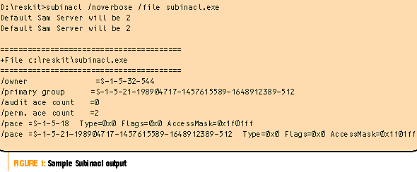 Существует несколько версий утилиты Subinacl: компания Microsoft выпустила первую версию вместе с пакетом .Microsoft Windows NT Server 4.0 Resource Kit, а вторую, обновленную версию, - с пакетом .Microsoft Windows 2000 Resource Kit. Эти версии немного различаются, так как Microsoft добавила дополнительные возможности в версию для системы Windows 2000, чтобы использовать особенности новой операционной системы. Однако при работе сценария ownedby.cmd, обе версии утилиты Subinacl будут вести себя одинаково. Чтобы просмотреть полный список параметров данной утилиты, наберите в командной строке команду:subinacl.exe /help /fullЧтобы использовать команду Subinacl для просмотра списка управления доступом для определенного файла, просто наберитеsubinacl.exe /file filenameгде filename I – это имя файла. Так как вам не требуется вся информация, предоставляемая этой командой, вы можете добавить параметр /noverbose, чтобы отобразить лишь сводку по информации из списка управления доступом файла. На Рисунке 1 показан пример вывода командой Subinacl с использованием всех параметров. Как вы видите, одна из строк содержит фразу «/owner = S-1-5-32-544», которая означает, что идентификатор безопасности пользователя – «S-1-5-32-544».