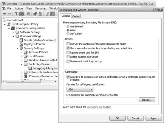 Новые параметры настройки EFS обеспечивают управление EFS, конфигурацией безопасности, параметрами сертификата и закрытого ключа, а также кэшированием. В домене Windows эти параметры можно применить через групповую политику, чтобы управлять поведением EFS на рабочих станциях пользователей. Доступ к параметрам EFS можно получить из свойств контейнера Computer ConfigurationWindowsSettingsSecurity SettingsPublic KeyPoliciesEncrypting File System (экран 4). На иллюстрации не показаны параметры кэша EFS-ключа шифрования, которые управляются из вкладки Cache.