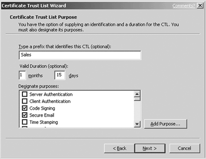 В контейнере Enterprise Trust хранится набор списков сертификатов, заслуживающих доверия (Certificate Trust List, CTL). Список CTL представляет собой заверенный перечень сертификатов центров CA. Данные сертификаты можно считать известными сертификатами только в том случае, если список CTL подписывается с использованием секретного (private) ключа, открытый ключ которого был выпущен другим центром CA — доверенным. Администратор может накладывать ограничения на срок действия записей CTL, а также определять перечень приложений, для работы с которыми данный список будет действителен. Для этого следует запустить оснастку Group Policy Object, перейти к контейнеру Enterprise Trust (User Configuration Security Settings Public Key Policies Enterprise Trust), щелкнуть на нем правой кнопкой, после чего выбрать New, Certificate Trust List. В результате запустится программа Certificate Trust List Wizard, окно которой показано на экране 4.