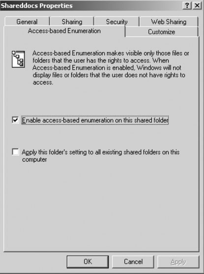 Что же касается метода ABE, он может пополнить ваш арсенал. Этот метод позволяет делать невидимыми папки и файлы совместно используемых ресурсов для тех пользователей, которые не имеют разрешения на доступ к ним.