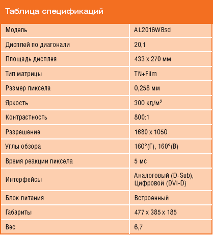 Модель AL2016WBsd воплощает в себе достоинства новейших жидкокристаллических мониторов и по целому ряду ключевых характеристик превосходит аналогичные по функциональности «квадратные» 19-дюймовые устройства. Широкий формат матрицы позволяет использовать больше полезной площади экрана, что обеспечивает лучшее восприятие и «эффект присутствия» при просмотре фильмов. Высокое разрешение — 1680 х 1050 — и отличная цветопередача делают изображение максимально реалистичным. Благодаря широким углам обзора работа за монитором становится существенно более комфортной при просмотре изображения группой пользователей. Для модели AL2016WBsd характерны высокая яркость — 300 кд/м2 и контрастность 800:1. Цифровой интерфейс DVI-D позволяет без искажений осуществлять передачу информации от компьютера.