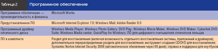 Набор программного обеспечения, поставляемого с компьютером, впечатляет: практически сразу после установки можно начинать работать. Правда, через 60 дней придется купить антивирус, так как бесплатное использование Symantec Norton Internet Security 2008 ограничено этим сроком. Программный пакет Microsoft Works, поставляемый с компьютером, несколько скромнее по возможностям, чем Microsoft Office, но вполне может удовлетворить требованиям большинства пользователей.