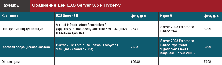 Таблица 2. Сравнение цен EXS Server 3.5 и Hyper-V