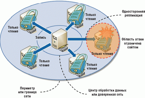Проблемой любого развертывания AD с операционными системами Windows 2000 или Windows 2003 всегда было размещение контроллеров домена в удаленных местах (например, офисах филиалов), физическая защищенность которых зачастую ниже, чем у информационного центра компании.