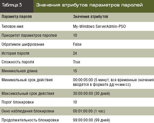 Используйте мастер Create Object, чтобы создать новый объект msDS-PasswordSettings. Создайте объект со значениями атрибутов, показанных в табл. 3. Полученный новый объект параметров пароля, My-Windows ServerAdmin-PSO (наряду с другими параметрами), требует, чтобы указанные пользователи вводили 15-символьный пароль, который нужно менять через каждые 30 дней. Объект PSO вступает в силу после того, как будет применен к объектам пользователей и групп (на следующем этапе).