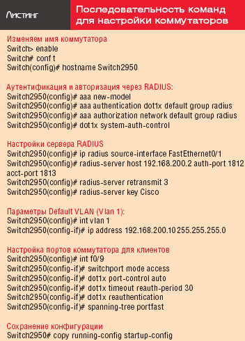 Теперь приступим к настройке оборудования Cisco. Список необходимых команд приведен в листинге, я лишь вкратце поясню последовательность действий. Через терминальный кабель следует подключиться к Cisco Catalyst 2950 и для начала изменить имя коммутатора, чтобы потом не запутаться, поскольку предстоит повторить такую же последовательность для модели 3550. Далее настраиваем аутентификацию и авторизацию через службу RADIUS: прежде всего, задаем настройки сервера RADIUS; он должен быть доступен через первый порт коммутатора. Далее настраиваем параметры Default VLAN (Vlan 1). Следующий шаг — настроить порты коммутатора, к которым будут подключаться клиенты. Порт 9 в листинге выбран для примера, аналогичная настройка должна выполняться для всех портов, к которым будут подключаться клиенты. На последнем шаге останется только сохранить конфигурацию.