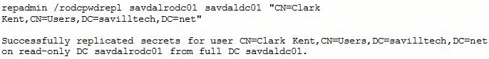 О. . Чтобы заранее ввести учетные данные определенного пользователя, откройте объект компьютера для контроллера домена только для чтения и выберите вкладку Password Replication Policy. Щелкните на кнопке Advanced и следуйте инструкциям. Чтобы заранее ввести учетные данные из командной строки, используйте команды repadmin и rodcpwdrepl в следующем формате, где заполняемый RODC является контроллером RODC, на котором нужно кэшировать учетные данные; DC, из которого ведется репликация, представляет собой контроллер домена, на котором находятся учетные данные. В качестве примера я использовал команды repadmin и rodcpwdrepl для репликации учетных данных Кларка Кента из контроллера доменаsavdaldc01 в savdalrodc01 с помощью следующей команды (приведен и полученный вывод).