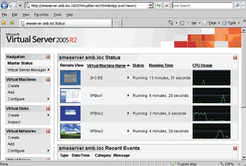 Установка платформ виртуализации. При рассмотрении средств виртуализации нужно выбрать поставщиков. Обычно поставщики предлагают на выбор несколько платформ и средств управления. Для простоты я укажу на популярные продукты виртуализации Microsoft и VMware. Установка платформ виртуализации для моих испытаний прошла довольно легко. Я загрузил Virtual Server 2005 R2 (см. врезку «Дополнительные материалы», ссылку «Загрузка Virtual Server 2005 R2») и установил этот сервер на две системы Windows Server 2003 R2 в соответствии с инструкцией по установке. После установки появилась информационная страница, как получить доступ к Web-странице Virtual Server Administration. Интерфейс для управления интуитивно прост, процесс создания и инициализации новых систем идет без задержек.