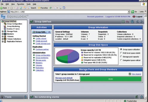 Установка и настройка массива iSCSI. Установка массива хранения EqualLogic iSCSI была довольно простой благодаря средствам Host Integration Tools, поставляемым на компакт-диске. Если для управления хранилищем применяется инструмент Microsoft Storage Manager для сетей SAN (SMfS), который есть в Windows 2003 R2 и более новых версиях, необходимо убедиться, что поставщик системы хранения предоставляет службу виртуальных дисков Virtual Disk Service (VDS), которая, по существу, является интерфейсом между системой хранения и Microsoft VDS. В проведенных испытаниях процесс установки инструментов EqualLogic обнаружил SMfS и автоматически установил провайдер аппаратных средств VDS. Я воспользовался средствами поставщика для инициализации массива хранения, настроил группу хранения и установил настройки iSCSI моего сервера для доступа к системе SAN. Я пользовался Web-консолью SANTest Group Manager (см. экран 1) для подготовки начального тома и базового мониторинга сети SAN и задач управления при использовании системы хранения. Настройка массива и подготовка управления через SMfS заняли около часа.