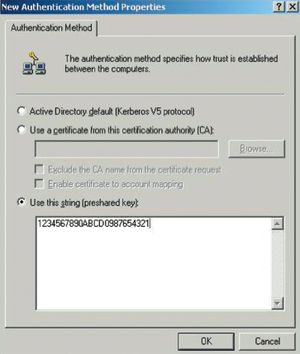 В диалоговом окне New Authentication Method Properties выберите Use this string (preshared key) и нажмите Enter. На экране показано добавление метода аутентификации с ключом PSK.