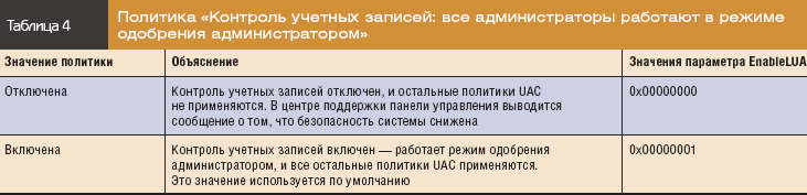 Основная политика, определяющая состояние контроля учетных записей и всех остальных его политик, не изменилась, что отражено в таблице 4.