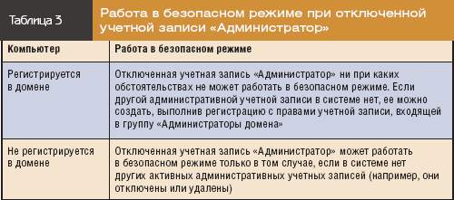 Таблица 3. Работа в безопасном режиме при отключенной учетной записи «Администратор»