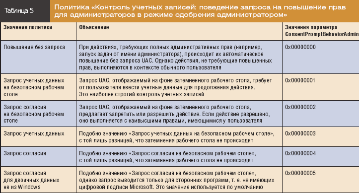 Таблица 5. Политика «Контроль учетных записей: поведение запроса на повышение прав для администраторов в режиме одобрения администратором»