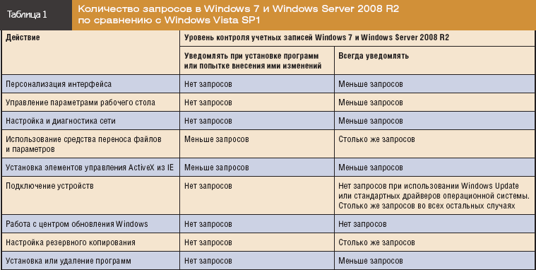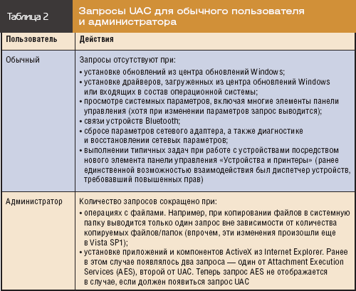 Многие компоненты новых операционных систем были переработаны, чтобы уменьшить количество запросов UAC и сделать работу пользователей более комфортной. Положительные изменения произошли в работе как обычных пользователей, так и локальных администраторов (см. таблицу 2).