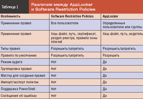 Таблица 1. Различия между AppLocker и Software Restriction Policies