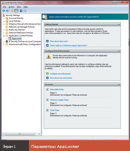 AppLocker — новое приложение в составе Windows 7 и Windows Server 2008 R2, предназначенное для замены Software Restriction Policies. AppLocker содержит новые возможности для проверки действий пользователей со стороны администратора. Данное приложение позволяет следить за тем, как будут использоваться исполняемые файлы, сценарии, файлы msi (файлы Windows Installer) и библиотеки DLL.