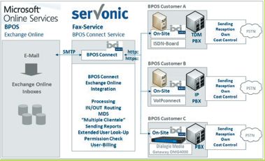 Благодаря новому BPOS Connect Service компании serVonic система IXI-UMS теперь сможет выступать в качестве решения для работы с факсами «в облаке». Компания serVonic в данном случае является не только разработчиком программного обеспечения, но и провайдером, осуществляя подключение, маршрутизацию и контроль трафика отправки и получения факсов для потребителей службы BPOS Exchange Online. Пользователи Microsoft Exchange Online могут применять эту «службу маршрутизации» от компании serVonic за ежемесячную плату.