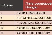 Итак, у Google существует пять серверов, которые можно указывать в качестве MX-серверов для домена компании. Они представлены в таблице с приоритетами.