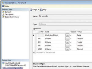 - Принять решение об именах баз данных. На основе фасета баз данных я составил условие No tempdb, включающее все пользовательские базы данных и три оставшиеся системные базы данных. Это условие, представленное на экране 1, также позволяет убедиться, что статус каждой базы данных есть Normal.