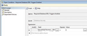 - Создать условие проверки наличия неактивных или недоступных триггеров. Здесь можно выбрать любой фасет, позволяющий проверять условия на объектах баз данных, например Database или Database Security. В листинге 4 представлено выражение, определяющее количество триггеров DDL, созданных пользователями, активных в конкретной базе данных. Затем мы применяем функцию ExecuteSQL, которая допускает вставку предложения SELECT в PBM-выражение, как показано в листинге 5. Я использовал это выражение для условия Required Database DDL Triggers Enabled соответствующей политики (экран 2). Заметим, что в область окна на экране помещается только начало оператора.