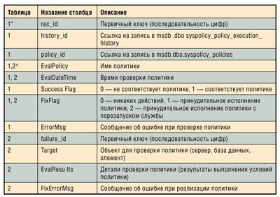 | Таблица. Описание столбцов таблицы dbo.PolicyEvaluation (*) и таблицы dbo.PolicyEvaluation_FailureDetails (^) |
