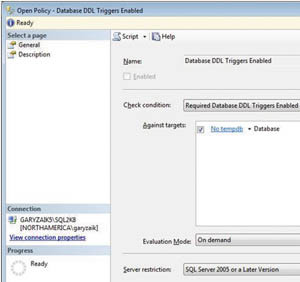 Мне было предложено создать политику для проверки, были ли активизированы все обязательные триггеры DDL в каждой базе данных на каждом сервере SQL Server 2005 (или более новых версиях). Для этого я должен был выполнить следующие шаги: