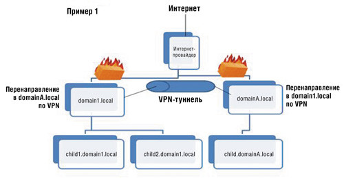 Рассмотрим случай, когда одна компания приобретает другую и каждая из них имеет независимое пространство имен. Эти пространства должны быть функционально объединены с использованием доверительных отношений Windows Server. Предлагаемый подход заключается в создании безопасной виртуальной частной сети (VPN) между средами двух компаний в корне каждого отдельного непрерывного пространства имен. Передача запросов об именах по сети VPN в пространство имен на противоположном конце «VPN-туннеля» осуществляется с использованием серверов пересылки, как показано на рисунке. Любые запросы, не удовлетворяющие критериям условий сервера пересылки, направляются на серверы DNS поставщика услуг Интернета (ISP). Серверы DNS, настроенные на пересылку по условию и расположенные на корневом уровне одного из двух непрерывных пространств имен, направляют запросы на конкретный сервер DNS, расположенный в другом непрерывном пространстве имен. На этом сервере DNS в кэше накапливается информация о пространстве имен, что снижает необходимость в рекурсии.