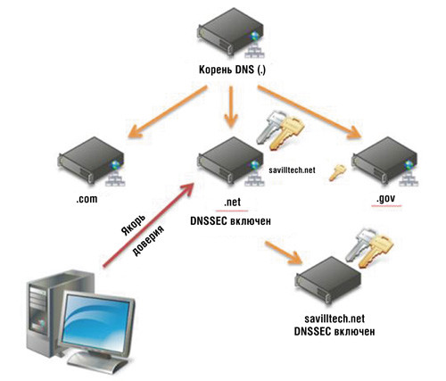 Данная функциональность не распространяется на отношения между клиентом DNS (например, вашей рабочей станцией) и уполномоченным сервером DNS, обслуживающим ваш запрос. Настроить якоря доверия на стороне клиента DNS просто невозможно. На самом деле, хотя я использую термин «клиент DNS», технология DNSSEC проявляет все свои достоинства только при взаимодействии между серверами DNS. В обычном процессе разрешения имен DNS клиент отправляет запрос локальному серверу DNS, а тот в свою очередь осуществляет рекурсивный поиск ответа. Таким образом, ваш сервер DNS является звеном, которому необходим механизм проверки ответов. В большинстве окружений клиент не выполняет проверку ответов: если локальный сервер использует технологию DNS, клиент доверяет проверку ответов ему.