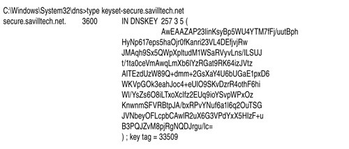 Кроме того, вы можете вручную настроить якоря доверия внутри службы DNS, указав имя зоны и открытый ключ, выдаваемый серверами именования (экран 1). После того как будет настроена точка входа (то есть якорь доверия) для цепочки доверия и вы зададите ключ подписывания ключа (подробнее я расскажу о нем ниже), необходимо установить флаги Secure Entry Point (SEP) и Zone Signing Key. Если вы хотите настроить общий доступ к открытому ключу, чтобы другая организация или хранилище могли добавить его в качестве якоря доверия, данная организация должна получить доступ к содержимому файла \%systemroot%\System32\dns\keyset-<имя зоны> (экран 2).