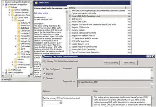 В системах Server 2008 R2 и Windows 7 впервые появилась возможность настраивать уровень регрессии на стороне клиента DNS. Как администратор, вы можете указать, активирован ли механизм Devolution и на какой уровень регрессии ему разрешен доступ. Например, указав уровень регрессии 2, в процессе разрешения имени вы сможете «опуститься» до корневого домена леса (FRD) второго уровня (например, savilltech.net). Указав уровень 3, вы сможете работать только с доменом DNS третьего уровня (например, na.savilltech.net).