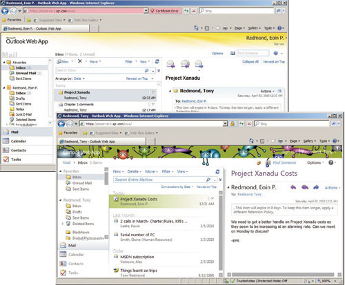 В версии Exchange 2010, выпущенной в 2009 году, пользовательский интерфейс клиента OWA был весьма продуктивным, и для его освоения никому из пользователей не приходилось ломать голову. А значит, задача разработчиков состояла в том, чтобы усовершенствовать OWA, но не за счет его эффективности. Специалисты корпорации уделили клиенту много внимания и, как показано на экране 1, две версии разительно отличаются друг от друга. Ряд отличий можно наблюдать, что называется, невооруженным глазом.