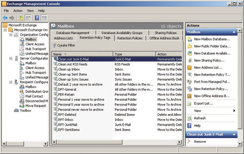 - возможность управления политиками хранения и тегами силами администраторов с помощью графической консоли управления Exchange Exchange Management Console (EMC);