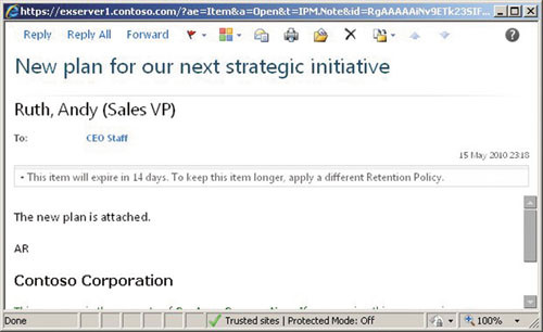 После того как политика хранения применена к почтовому ящику, помощник для управляемых папок применяет содержащиеся в политике теги хранения к объектам, размещенным в этом ящике, в ходе следующей операции по его обработке. И теперь уже пользователи могут увидеть эффект тегов хранения с четкими указаниями в окнах клиентов OWA и Outlook 2010. На экране 4 представлено отображенное в OWA электронное послание с примененной к нему политикой хранения. Здесь видно, что период хранения для тега на объекте составляет 14 дней, по истечении которых данный объект будет вновь обработан средствами помощника для управляемых папок, и затем будет выполнено действие, указанное в теге.