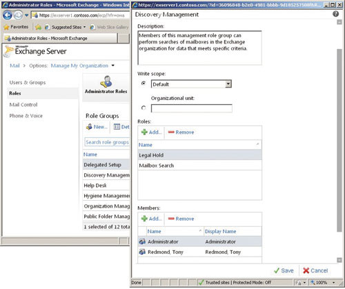 Пакет SP1 не в состоянии компенсировать пробелы в знаниях администраторов, но он может предложить графический интерфейс, способный защитить администраторов от хитросплетений механизма RBAC, и именно такой интерфейс был реализован в модернизированном разделе Roles в ECP. То обстоятельство, что Microsoft в качестве платформы управления для RBAC выбрала не консоль EMC, а панель ECP, у некоторых может вызвать удивление. Разумеется, в качестве контраргумента можно выдвинуть тезис о том, что EMC — заповедная зона действий администраторов Exchange, но рассуждать так — значит игнорировать выгоды, связанные с предоставлением функциональных возможностей через веб-приложение, которое может запускаться с любого компьютера, поддерживающего браузеры Internet Explorer (IE), Chrome или Firefox. И действительно, в дополнение к средствам управления RBAC панель ECP включает в себя такие функциональные возможности, как доставка отчетов отсутствующие в EMC, что указывает на дифференциацию в выборе инструментов, существующую, по крайней мере, в умах разработчиков Microsoft, если не в умах реальных администраторов.