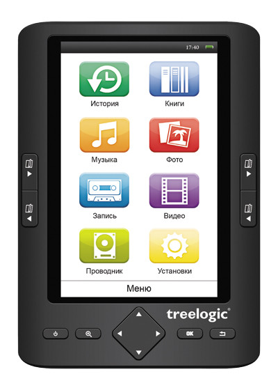 Главными достоинствами устройства Treelogic Arcus 501 являются: поддержка всех распространенных форматов электронных книг, яркий цветной TFT-экран диагональю 5 дюймов, встроенный MP3 плеер и видеопроигрыватель, диктофон для записи голоса и FM-радиопередач, поддержка FM-радио, встроенный динамик, компактные размеры, стильный внешний вид, продуманное и эргономичное управление, длительное время работы и невысокая стоимость. Оригинальный и стильный дизайн, богатая функциональность, высокое качество изготовления и отличные эргономические характеристики делают новое устройство для чтения электронных книг Treelogic Arcus 501 настоящей находкой для тех, кто желает получить качественный и функциональный TFT-ридер за очень умеренную цену. Устройство оснащено цветным 5 дюймовым TFT-дисплеем с разрешением 480х800 пикселов и соотношением сторон 16:9. Экран способен отображать 262 тысячи оттенков цвета и обработан специальным антибликовым покрытием. Несмотря на малую толщину ридера (всего 10,6 мм), на гранях корпуса также нашлось место для функциональных элементов — в частности, на нижней грани удобно расположились все разъемы: стандартный 3,5 мм мини-джек для подключения наушников, слот для карты памяти формата microSD/T-Flash, гнездо для подключения зарядного устройства и miniUSB-разъем для обмена данными с компьютером.
