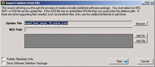 - В окне Import Update from File, показанном на экране 1, нажмите кнопку Browse. Затем выберите ранее загруженный msi-файл Flash Player. Все файлы упакованы в установщике Flash Player MSI.