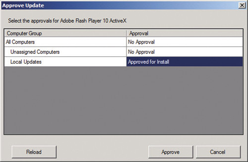 - В диалоговом окне Approve Update (экран 4) щелкните No Approval справа от группы Local Updates, а затем Approved for Install.