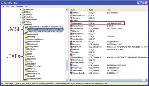 - Перейдите в раздел реестра HKEY_LOCAL_MACHINE\Software\Microsoft\Windows\CurrentVersion\Uninstall. Приложения, установленные с файла. msi, имеют глобальный уникальный идентификатор (GUID) для раздела Uninstall; приложения, установленные с файла. exe, содержат имя приложения. Имена приложений. exe определяются без труда, тогда как с определением глобальных уникальных идентификаторов для приложений. msi дело обстоит немного сложнее. Чтобы определить, какое приложение соответствует тому или иному идентификатору, выделите этот глобальный уникальный идентификатор и найдите значение параметра DisplayName. На экране 1 показаны разделы Uninstall приложений. msi и. exe; там же вы увидите, как при выделении идентификатора GUID отображается значение параметра DisplayName. В нашем примере приложением. msi является XML Notepad 2007.