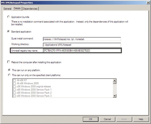 Теперь, располагая списком разделов uninstall приложений, вы можете использовать их для настройки оснастки DW набора средств MDT. Откройте оснастку и добавьте все приложения, которые следует установить в среде Windows 7, так же как вы добавляли приложение XML Notepad. Когда приложение добавляется в оснастку DW, его имя появляется на панели Details. Далее вам нужно настроить приложения с разделом Uninstall, выполнив следующие действия.